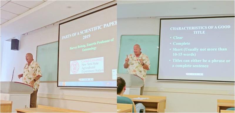Harvey Reissig教授为学院师生做了题为“PARTS OF A SCIENTIFIC PAPER, 2019”的学术报告,来自植保学院、资环学院等30余名师生参加了报告会。Harvey Reissig教授以案例的形式全面讲授了科技论文写作中同学们存在的常见问题,针对昆虫分类学科技论文写作进行了详细的讲解。报告结束后,参会师生就所关心的写作问题积极地与Harvey Reissig教授进行了热烈的交流和深入探讨。
