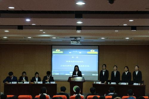 晚上七点半 ,表演赛正式开始。首先,主席向大家详细介绍了辩论赛比赛细则与到场评委嘉宾。随后,八位辩手依次入场就坐,比赛正式开始。